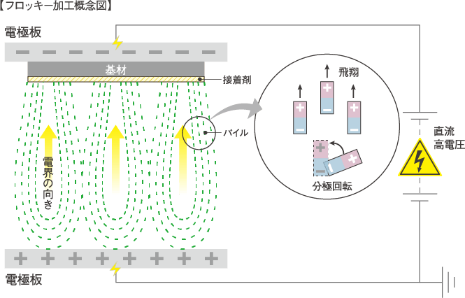 フロッキー加工は静電気を利用して加工が施されます。プラスとマイナスの電極板に電気を流し電界をつくることでパイルがどちらか一極に向かい吸い寄せられ帯電します。その中に接着剤を塗布した基材を入れることで、接着剤箇所にパイルが植え付けられるという仕組みです。