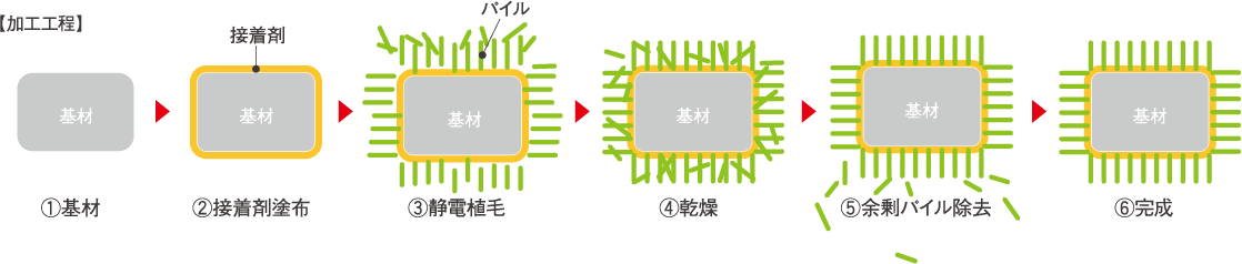 静電植毛(フロッキー加工)とは、電力を利用して素材(基材)に短繊維(パイル)を植え付ける加工技術です。様々な色や特徴を持つパイルを表面に塗布することで、柔らかで高級感ある製品となります。また、フロッキー加工は見た目以外にも断熱効果・保温効果・遮光性・結露防止など様々な機能をあわせ持っています。